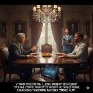 My father banned me from Thanksgiving and Christmas because I quit my corporate bank job to work online. In his world, if you weren’t clocking into an office, you were basically unemployed. My sister Rachel is a pediatrician, my brother Timothy is a civil engineer, and I run digital marketing businesses from a laptop. Dad called me an “embarrassment,” and I ate takeout alone while he posted proud photos of his “successful children.” He never knew I earned twice their salaries.