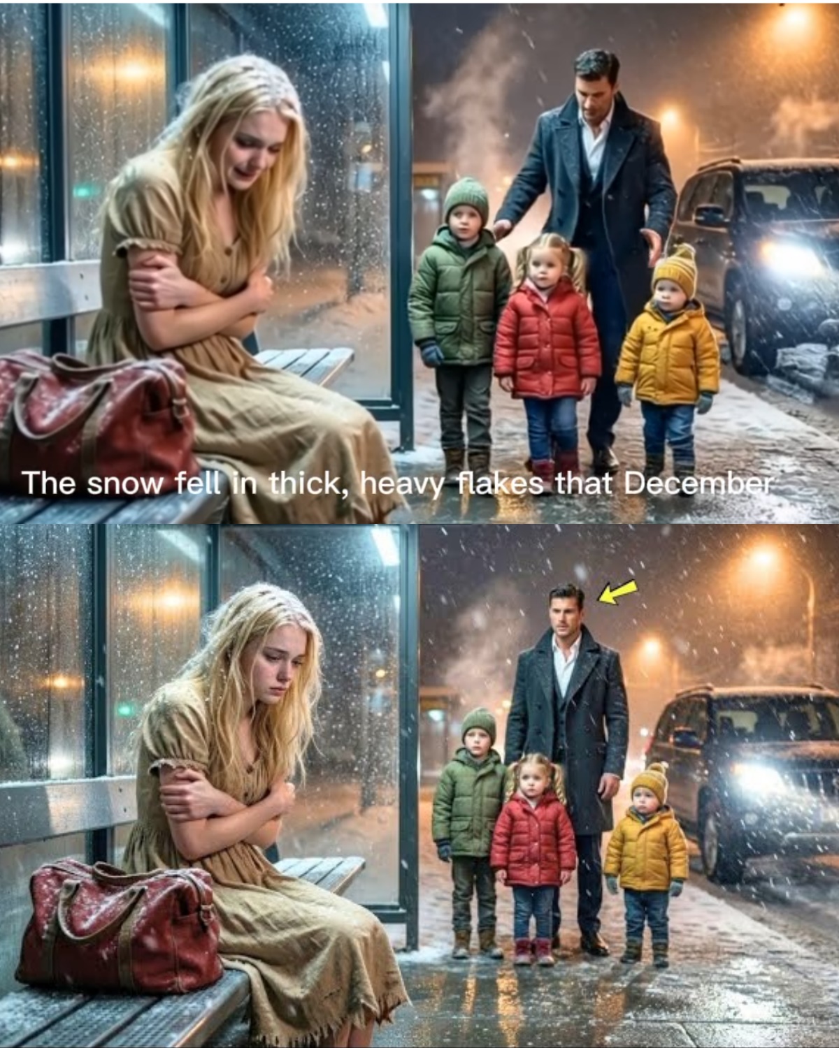 The snow fell in thick, heavy flakes that December evening, the kind that muffled the city’s usual noise and made everything feel isolated and still. The bus shelter where Clare Bennett sat offered little protection from the cold, and she huddled against the plexiglass wall, her arms wrapped around herself, trying to conserve what little warmth remained in her body. She was 28 years old, with blonde hair that fell in tangled waves past her shoulders, and she wore a thin olive-colored dress that had been meant for indoor wear, not for sitting outside in a snowstorm. A worn brown bag sat beside her on the bench, containing everything she now owned in the world: a change of clothes, some photographs, and the divorce papers that had been thrust into her hands three hours ago.