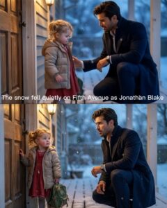 The snow fell quietly on Fifth Avenue as Jonathan Blake stepped out of his evening business meeting. At 37, he’d grown accustomed to these late nights, the endless negotiations that built his commercial development empire. His dark hair was touched with early flecks of silver, his tailored black coat a shield against both the cold and the world. Success had come early for Jonathan, but it had cost him something he was only beginning to understand he’d lost.