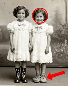 The girls appeared eight or nine, their hair curled and pinned identically, dresses matching to lace collar and puffed sleeves. They stood before a painted garden backdrop, popular in studio portraiture of the era. Everything suggested prosperity and care—except the shoes. Under magnification, Margaret saw the left girl’s polished leather button-up boots, clearly new. The right girl wore rough, hand-stitched canvas shoes with uneven seams, sagging toe box, and fabric-layered sole—workroom, institutional issue.