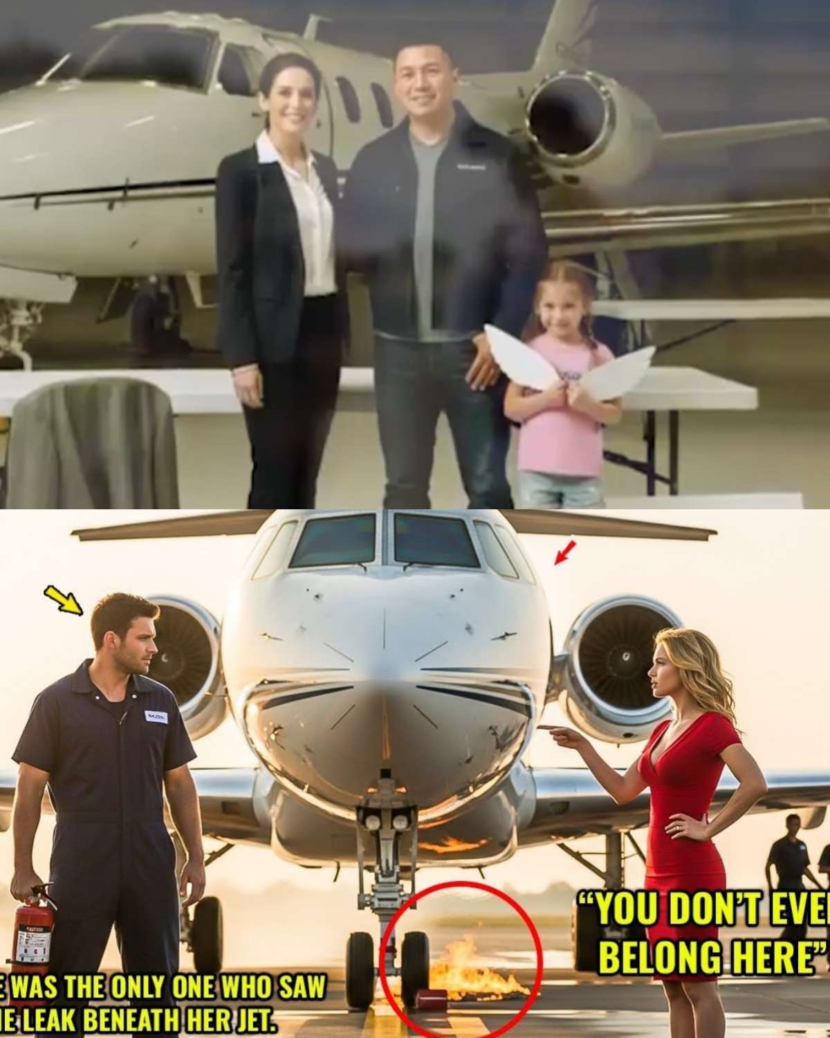 On the boarding stairs above, CEO Saraphina Sterling stood in her crimson designer dress, her eyes cold as they swept over him with unmistakable disdain. “You don’t even belong here,” she said, her voice cutting through the engine noise like a blade.