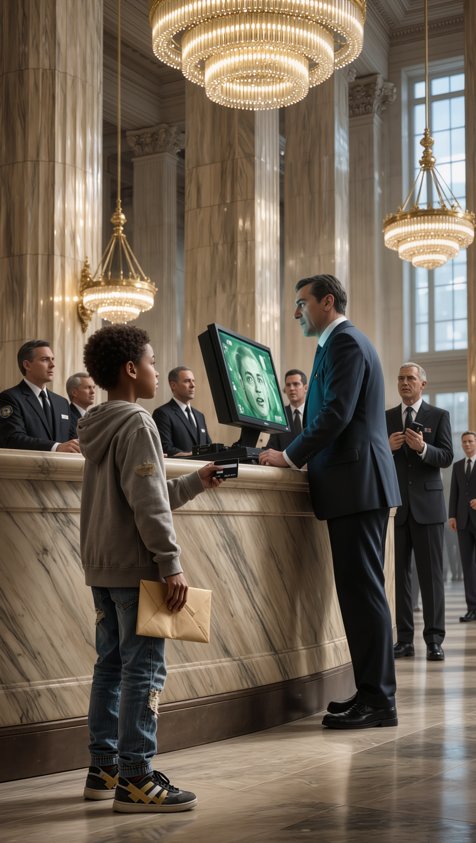 Marcus walked forward on legs that felt like they might give out. Every eye in the lobby was watching, judging, finding him lacking. His sneakers seemed impossibly loud. The envelope in his hand felt like it weighed a thousand pounds.