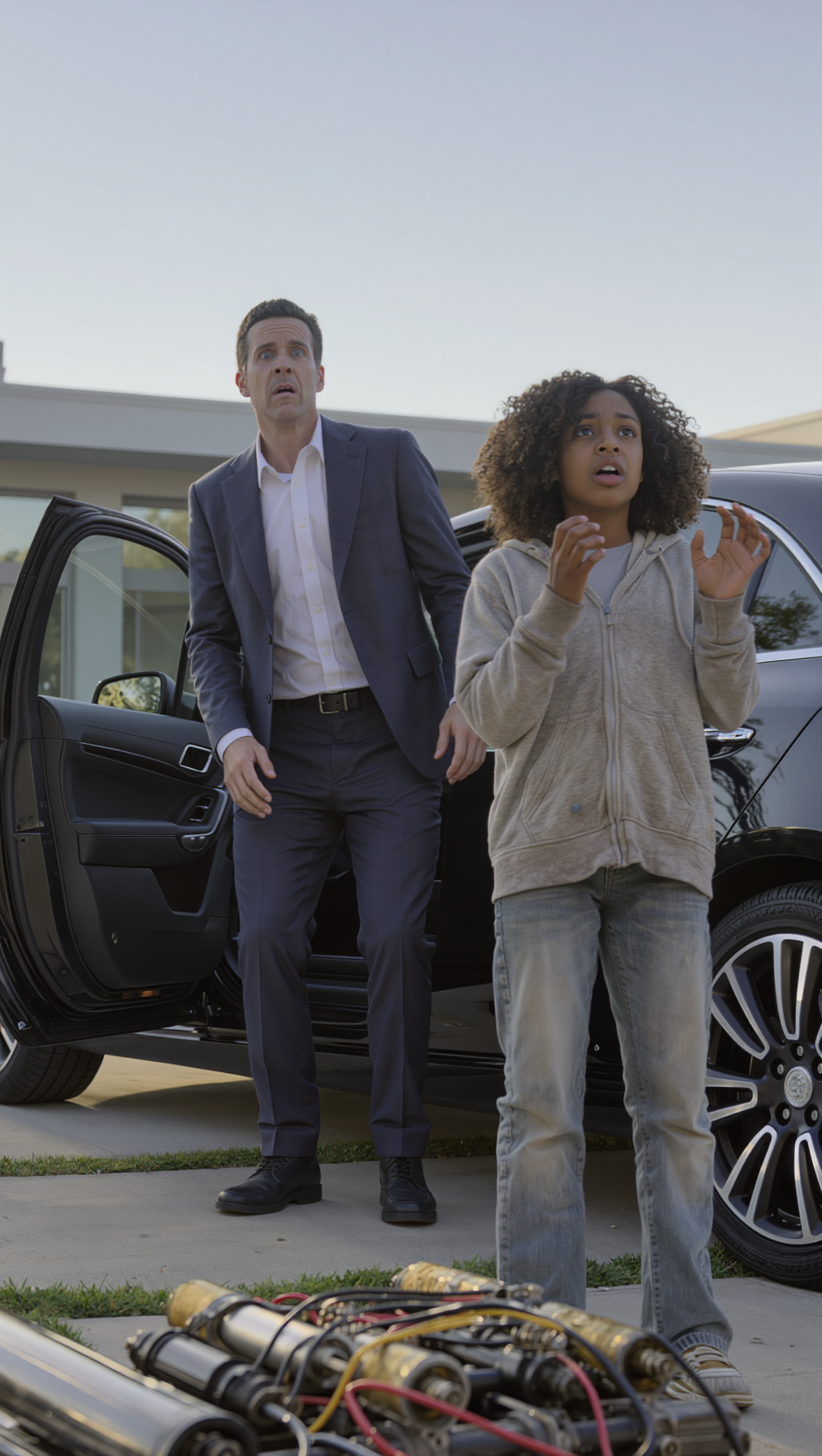 He crouched slightly to look under the car, but stopped. His phone buzzed—a text from his head of security about an urgent briefing that afternoon. Harrison sighed and straightened. “Later,” he muttered. “I’ll check later.” He pushed the key forward.