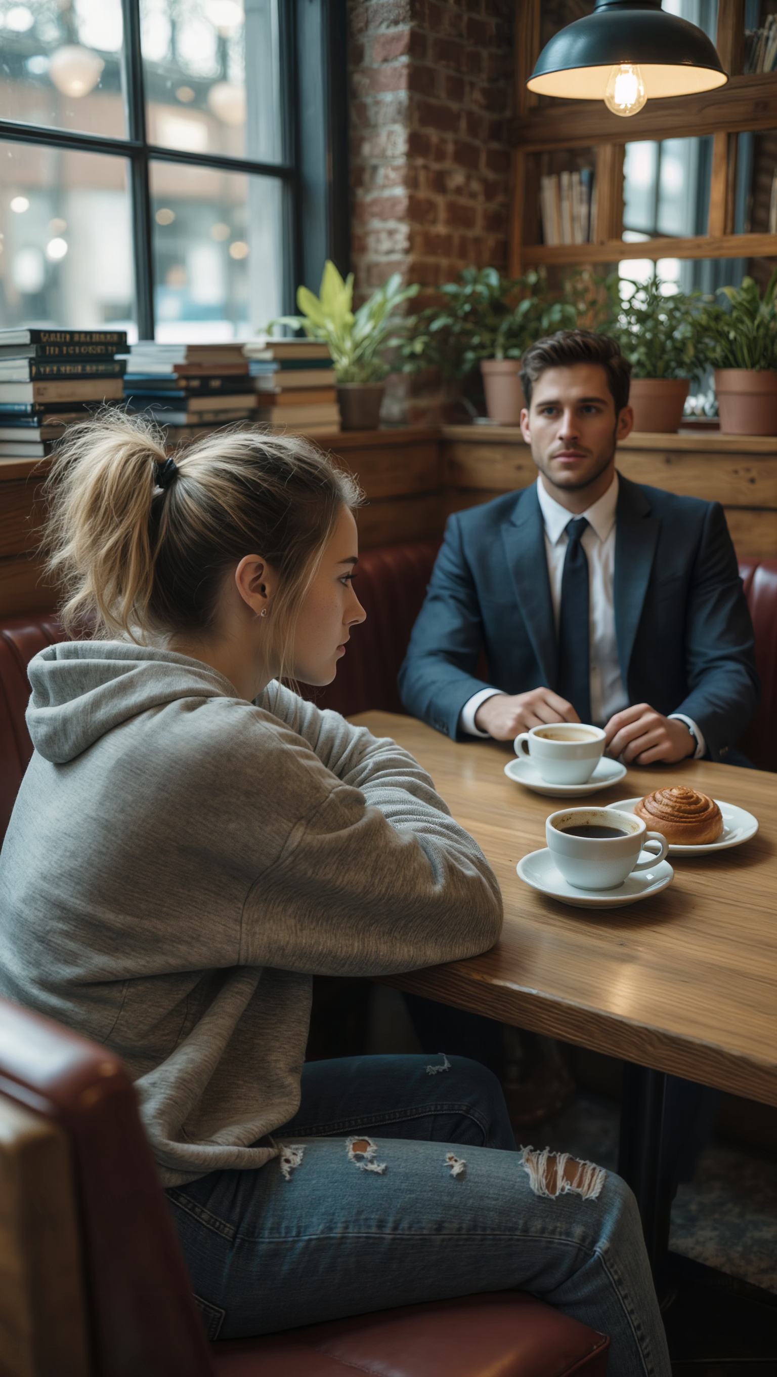 The coffee shop smelled of cinnamon and burnt espresso—a Tuesday afternoon refuge for anyone avoiding real life. Melissa Hart slouched in the corner booth, wrapped in an oversized gray sweatshirt that had seen better days, probably in 2015. Her hair was pulled back in a messy bun, not the fashionable kind, and her jeans bore a small stain on the knee from a pasta incident she’d rather forget. No makeup. Definitely no makeup. She checked her phone for the third time in five minutes, dreading the blind date her best friend Tracy had orchestrated.