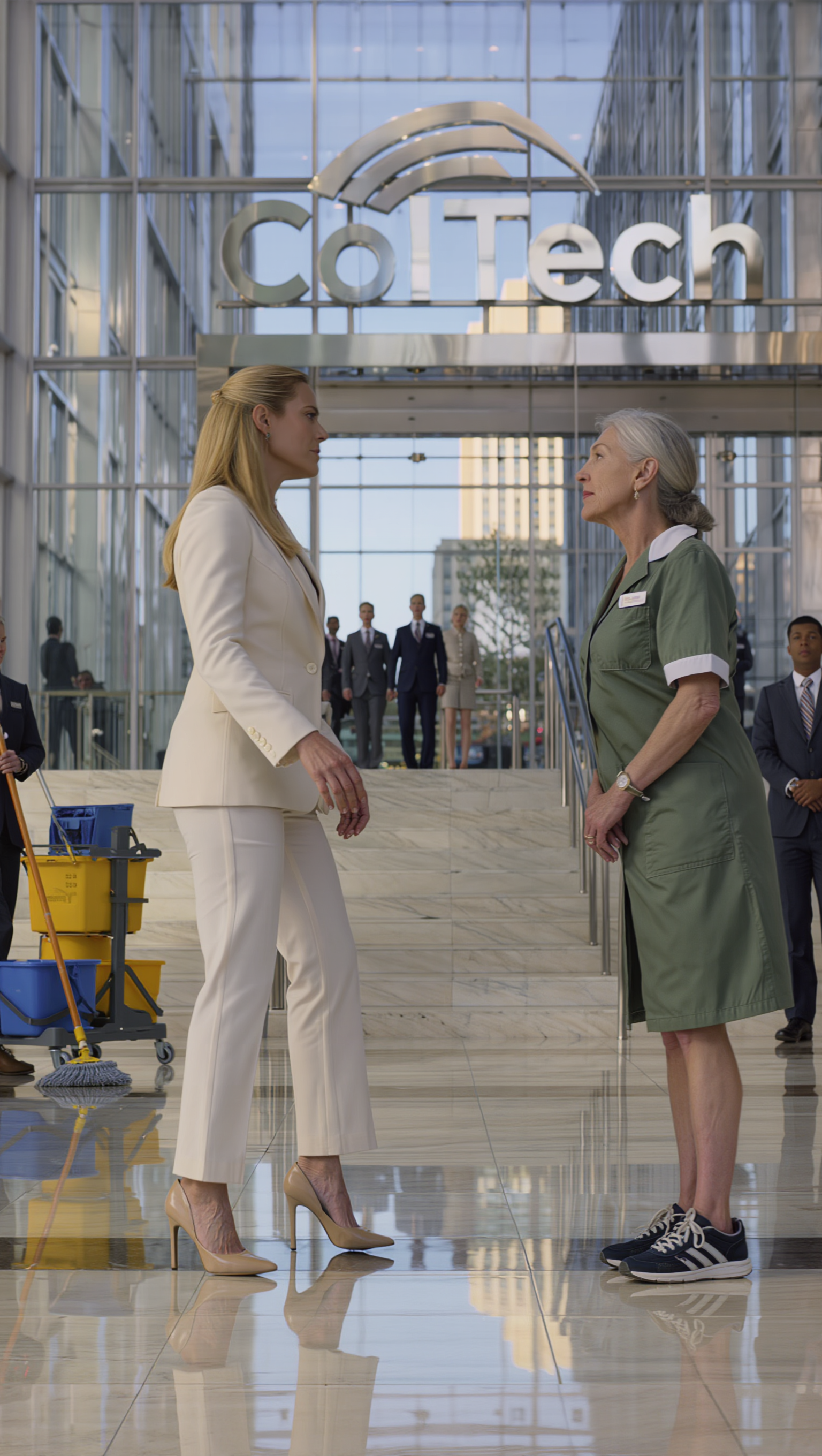 The morning sun splashed gold across the marble floors of ColTech Tower, painting the lobby in a glow reserved for the powerful. The air was thick with ambition and expectation, each employee moving with the precision of a well-oiled machine. But on this day, something different was about to unfold—a test, disguised in humility, that would shake the foundations of the tower and the lives within it.