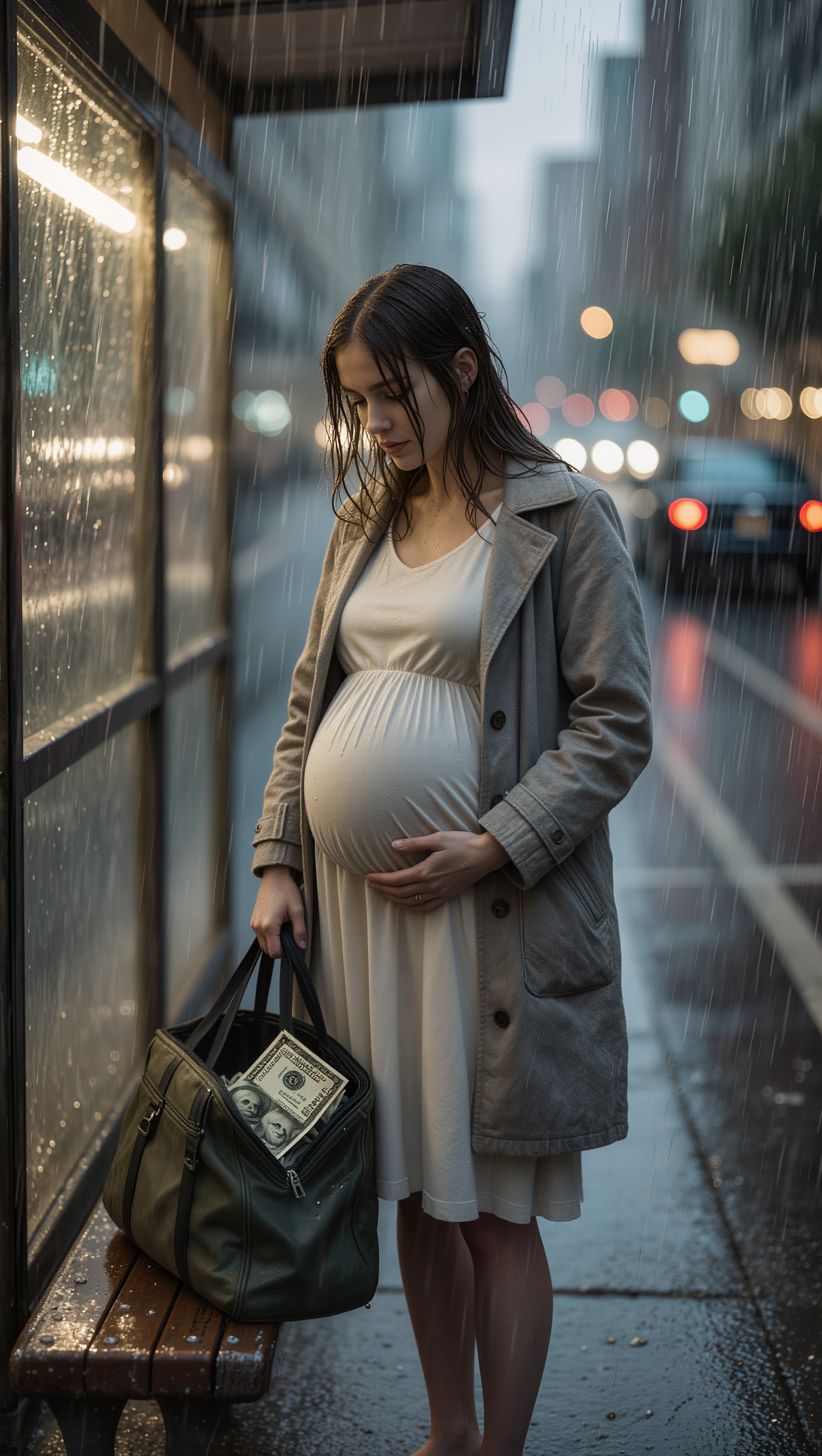 The elevator ride down felt endless. The rain outside was harder now, slapping her face, soaking through her clothes. She walked home in silence, clutching her stomach, trying not to cry because she knew stress was bad for the baby, trying to breathe, trying to survive.